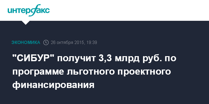 Москва. 26 октября. INTERFAX.RU -"СИБУР" получит 3,3 млрд рублей сроком на 6 лет по государственной программе поддержки инвестпроектов, реализуемых на основе проектного финансирования, которая была запущена в октябре 2014 года, сообщили "Интерфаксу" в Сбербанке России, который является уполномоченным банком по предоставлению кредитных средств.