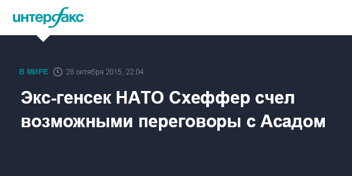 Москва. 28 октября. INTERFAX.RU - Генеральный секретарь НАТО в 2004-2009 годах голландец Яап де Хооп Схеффер в интервью фламандскому журналу Knack, перепечатанном бельгийским франкоязычным еженедельником Le Vif L'Express 28 октября, заявил о возможности диалога с Башаром Асадом ради сирийского урегулирования.