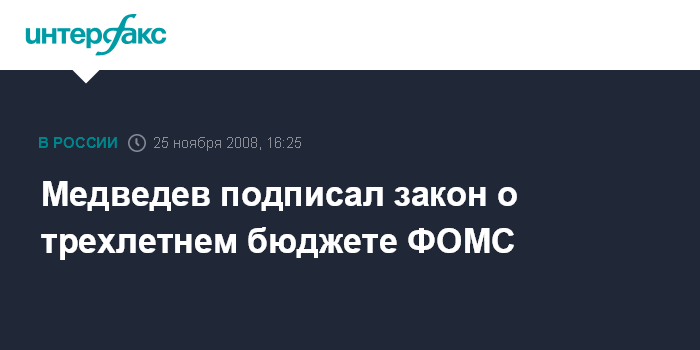 Москва. 25 ноября. INTERFAX.RU - Президент России Дмитрий Медведев подписал Федеральный закон "О бюджете Федерального фонда обязательного медицинского страхования на 2009 год и на плановый период 2010 и 2011 годов", сообщает пресс-служба Кремля.