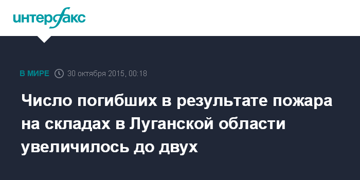 Москва. 30 октября. INTERFAX.RU - По предварительной информации, два человека погибли в результате пожара на военных складах в Сватово Луганской области, трое пострадали, сообщает советник главы МВД Украины Зорян Шкиряк.