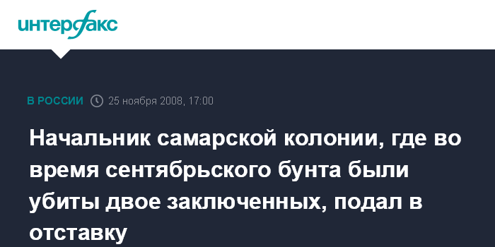 Москва. 25 ноября. INTERFAX.RU - Игорь Стариков, начальник самарской исправительной колонии №6, где во время недавнего бунта были убиты двое заключенных, написал рапорт об увольнении, сообщил агентству "Интерфакс-Поволжье" начальник пресс-службы ГУИН по Самарской области Артур Маливанчук.
