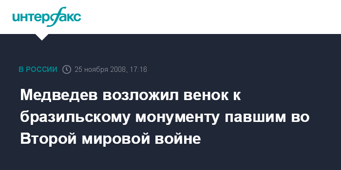 Москва. 25 ноября. INTERFAX.RU - Президент РФ Дмитрий Медведев начал во вторник программу официального визита в Бразилию с возложения венка к Национальному монументу павшим во Второй мировой войне.