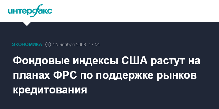 Министерство финансов предоставит $20 млрд "кредитной защиты" программе кредитования ФРС из одобренного в октябре Конгрессом "плана спасения" на $700 миллиардов. "Надеюсь, что одного этого решения будет достаточно для возвращения доверия на рынок и возобновления стабильной работы системы", - заявил главный директор по инвестициям Victoria Capital Management Эрик Маронак.