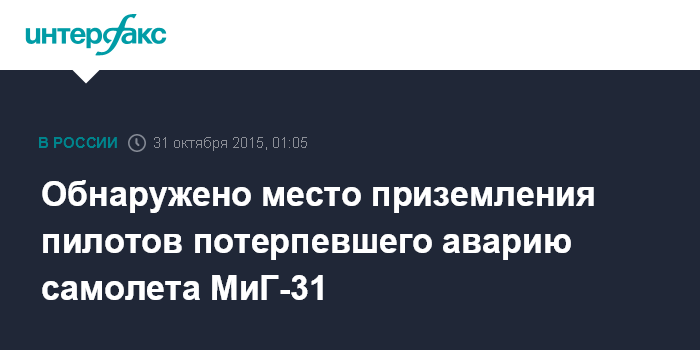 Москва. 31 октября. INTERFAX.RU - Экипаж самолета Ил-38 в ходе поисково-спасательной операции по работающему аварийному радиомаяку обнаружил место приземления обоих пилотов потерпевшего аварию самолета МиГ-31, сообщили "Интерфаксу" в управление пресс-службы и информации Минобороны РФ.