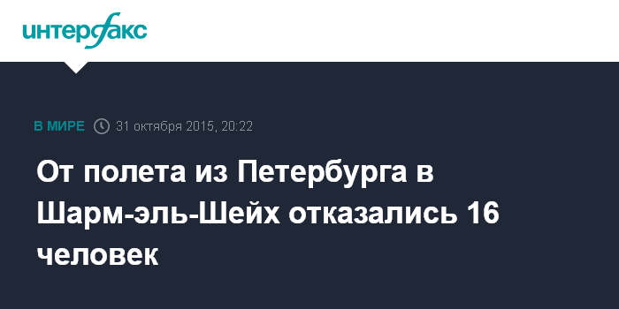 Москва. 31 октября. INTERFAX.RU - На регистрацию рейса авиакомпании "Когалымавиа" из петербургского аэропорта "Пулково" на египетский курорт Шарм-аль-Шейх в субботу вечером не явились 16 человек, сообщила "Интерфаксу" пресс-секретарь Российского союза туриндустрии (РСТ) Ирина Тюрина.