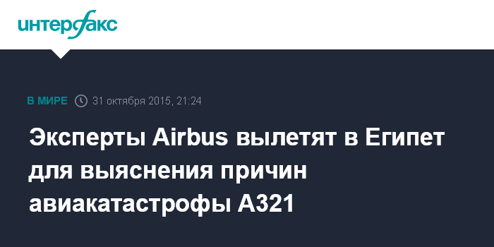 Москва. 31 октября. INTERFAX.RU - Группа из восьми специалистов прибудет в воскресенье из Франции в Египет для участия в расследовании обстоятельств крушения российского авиалайнера на Синайском полуострове, передает в субботу французское телевидение.