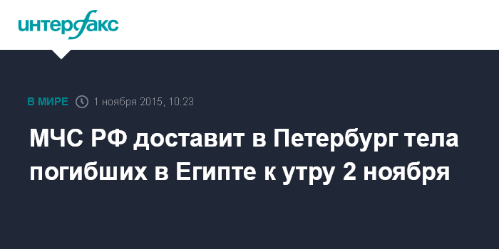 Москва. 1 ноября. INTERFAX.RU - Тела погибших в авиакатастрофе в Египте россиян будут доставлены в Санкт-Петербург вечером в воскресенье - утром в понедельник, сообщил на селекторном совещании в воскресенье замглавы МЧС Владимир Степанов.
