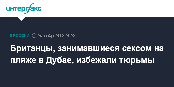Москва. 25 ноября. INTERFAX.RU - Апелляционный суд в Дубае принял решение о депортации без предварительного отбывания тюремного срока двух британских граждан, осужденных за занятие сексом на пляже, сообщает во вторник британская телерадиокорпорация BBC.