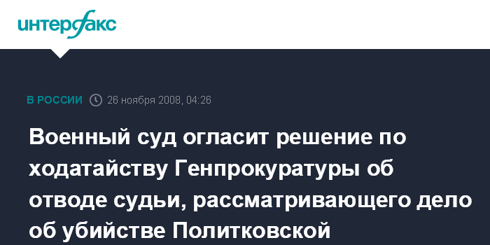 Москва. 26 ноября. ИНТЕРФАКС - Московский окружной военный суд огласит решение по ходатайству Генпрокуратуры РФ об отводе судьи, рассматривающего дело об убийстве обозревателя "Новой газеты" Анны Политковской.