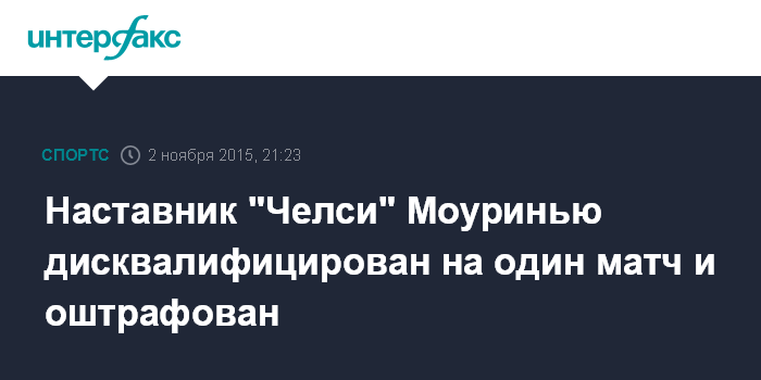 Москва. 2 ноября. INTERFAX.RU - Главный тренер "Челси" Жозе Моуринью дисквалифицирован на один матч, а также оштрафован на 40 тысяч фунтов стерлингов, сообщила пресс-служба английской Футбольной ассоциации (FA).