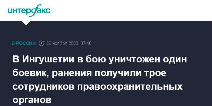Москва. 26 ноября. ИНТЕРФАКС - Один член незаконных вооруженных формирований уничтожен в ходе боестолкновения в районе ингушского села Даттых. При этом ранения получили трое сотрудников правоохранительных органов, сообщили агентству "Интерфакс" в штабе временной группировки войск на Северном Кавказе.