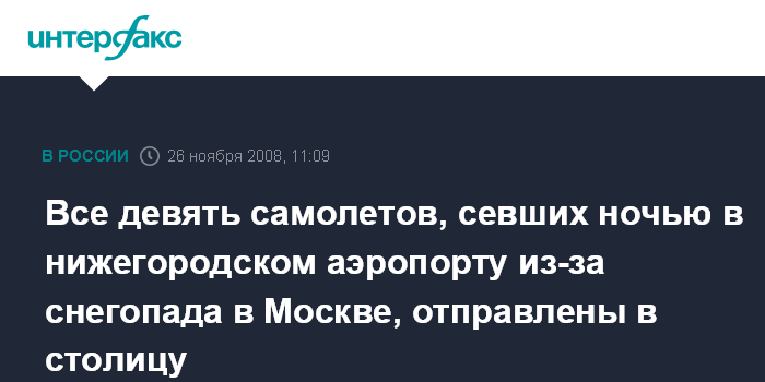 Москва. 26 ноября. INTERFAX.RU - В международном аэропорту "Нижний Новгород" в ночь на 26 ноября совершили вынужденную посадку девять самолетов, следовавших в Москву.