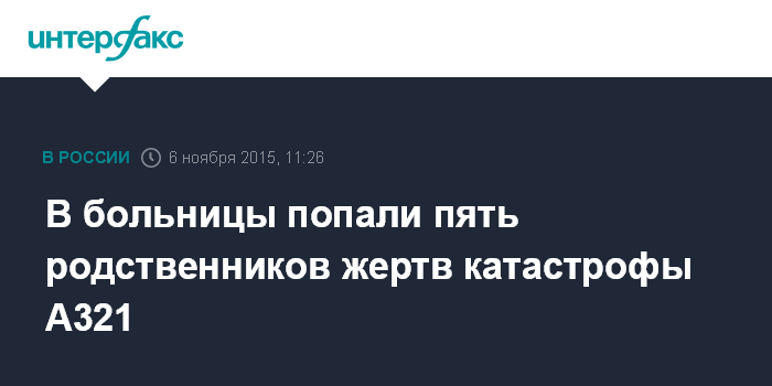 Москва. 6 ноября. INTERFAX.RU - По последним данным, госпитализированы пять человек из числа родственников жертв крушения российского лайнера в Египте. Об этом "Интерфаксу" в пятницу сообщил официальный представитель Минздрава России Олег Салагай.
