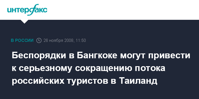 Москва. 26 ноября. INTERFAX.RU - Потоки туристов в Таиланд, в том числе из России, могут снизиться из-за продолжающихся в Бангкоке беспорядков и столкновений с оппозицией, считают представители крупных российских туроператорских компаний.