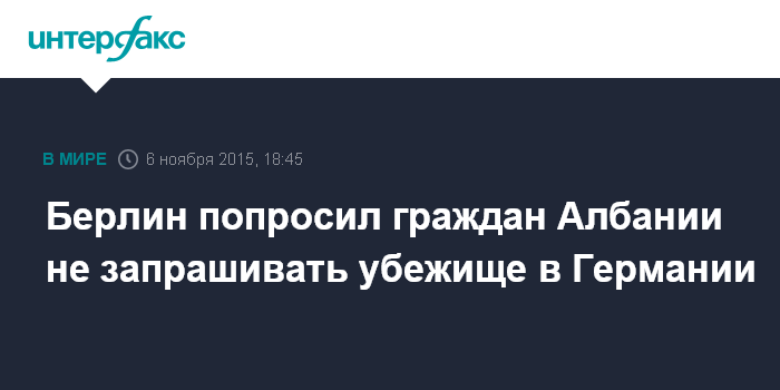 Москва. 6 ноября. INTERFAX.RU - Министерство внутренних дел Германии призывает граждан Албании прекратить попытки делать запросы на получение политического убежища в стране, сообщает агентство AP.