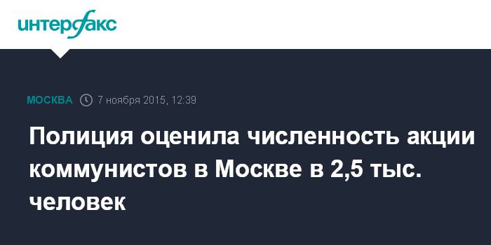 Москва. 7 ноября. INTERFAX.RU - Около 2,5 тыс. человек принимают участие в шествии, организованном КПРФ в честь 98-ой годовщины Октябрьской революции в Москве в субботу, на акции "Коммунистов России" присутствует не более ста человек, сообщил начальник пресс-службы столичного главка полиции Андрей Галиакберов.