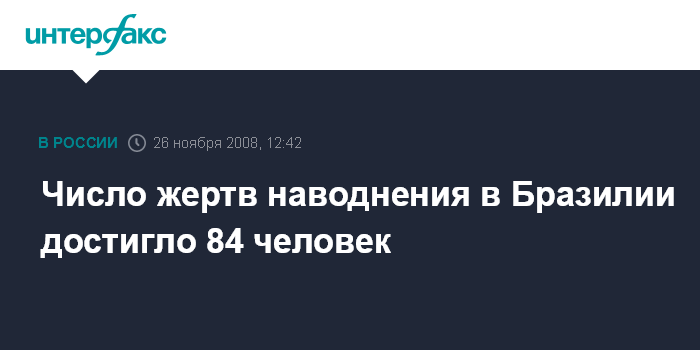Москва. 26 ноября. INTERFAX.RU - Количество жертв наводнения в южном бразильском штате Санта-Катарина увеличилось до 84 человек, сообщает британская телерадиокорпорация Би-Би-Си.