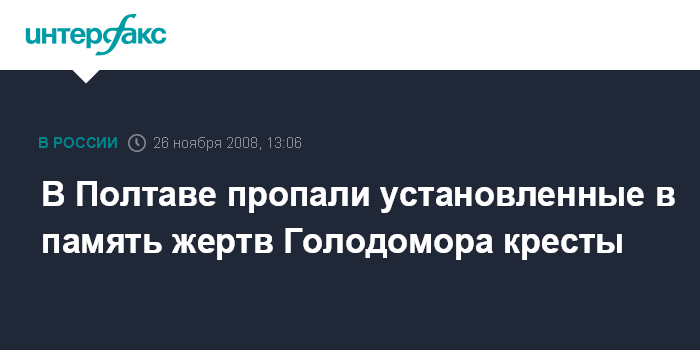 Москва. 26 ноября. INTERFAX.RU - В Полтаве пропали кресты, установленные несколько дней назад во время траурных мероприятий в память жертв голодомора 1932-1933 гг., сообщила в среду пресс-служба управления милиции Полтавской области.