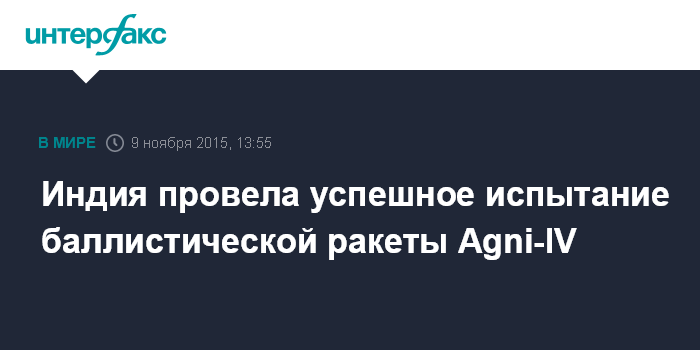 Москва. 9 ноября. INTERFAX.RU - Командование стратегических сил Индии в понедельник провело очередное успешное испытание баллистической ракеты среднего радиуса действия Agni-IV, способной нести ядерную головную часть, сообщил телеканал NDTV.