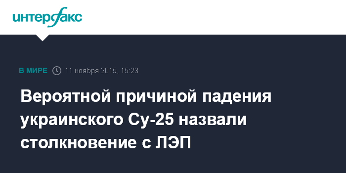 Москва. 11 ноября. INTERFAX.RU - По предварительной версии следствия, причиной крушения самолета Су-25 ВВС Украины в Запорожской области стало столкновение с высоковольтной линией электропередачи, сообщил главный военный прокурор, заместитель генерального прокурора Украины Анатолий Матиос.