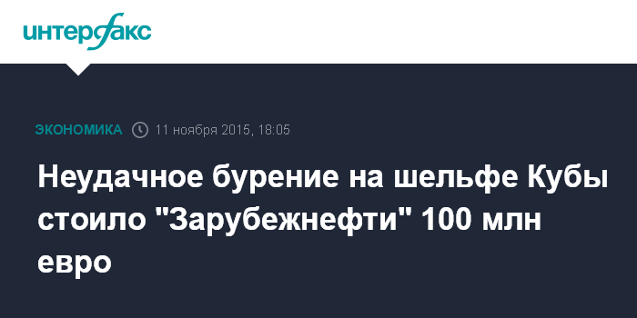 Москва. 11 ноября. INTERFAX.RU - Неудачное бурение скважины на блоке L на шельфе Кубы обошлось "Зарубежнефти" в 100 млн евро, сообщил заместитель генерального директора компании по геологии и разработке Игорь Афанасьев на конференции "Геологоразведка 2015".