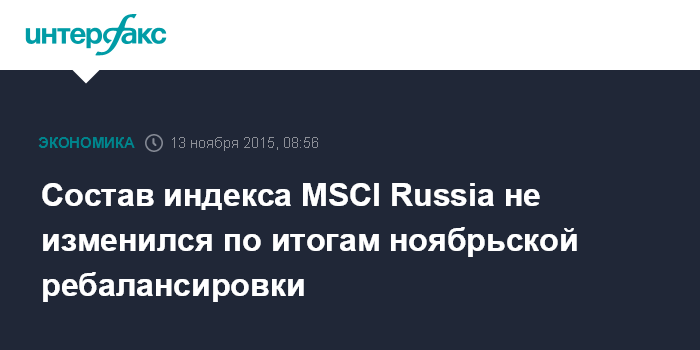 Москва. 13 ноября. INTERFAX.RU -Расчетная база индекса MSCI Russia по итогам ноябрьской ребалансировки, итоги которой были объявлены в ночь с 12 на 13 ноября по московскому времени, осталась без изменения, сообщил "Интерфаксу" аналитик "ВТБ Капитала" Илья Питерский.