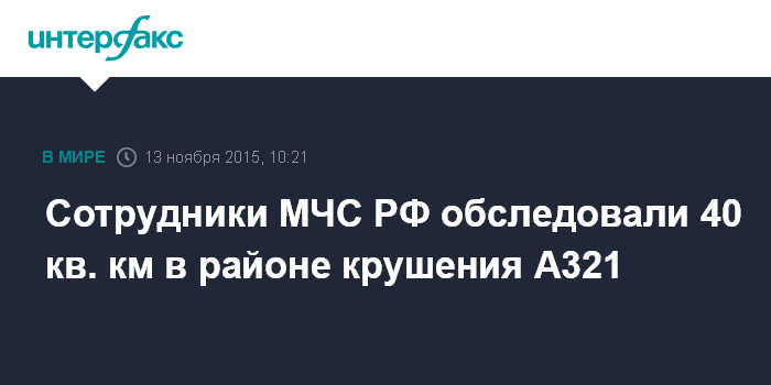 Москва. 13 ноября. INTERFAX.RU - Спасатели МЧС России продолжают поисковую операцию в районе авиакатастрофы в Египте, к настоящему моменту обследовано 40 кв. км пустыни, заявил глава МЧС РФ Владимир Пучков.
