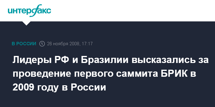 Москва. 26 ноября. INTERFAX.RU - Президенты России и Бразилии Дмитрий Медведев и Луис Лула да Силва поддерживают идею проведения в России в 2009 г. первого саммита БРИК (Бразилия, Россия, Индия, Китай), говорится в совместном заявлении лидеров двух стран.