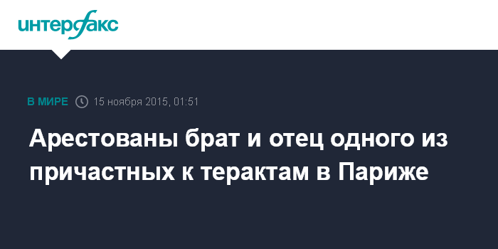 Москва. 15 ноября. INTERFAX.RU - Арестованы брат и отец одного из боевиков, причастных к терактам во Франции, сообщает Би-би-си.