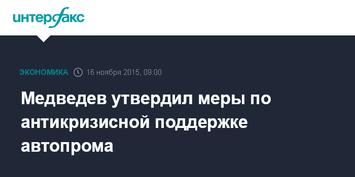 Москва. 16 ноября. INTERFAX.RU - Премьер-министр РФ Дмитрий Медведев подписал постановление, которое в соответствии с антикризисным планом правительства позволит обеспечить дополнительную загрузку производственных мощностей предприятий автомобильной промышленности и смежных отраслей.
