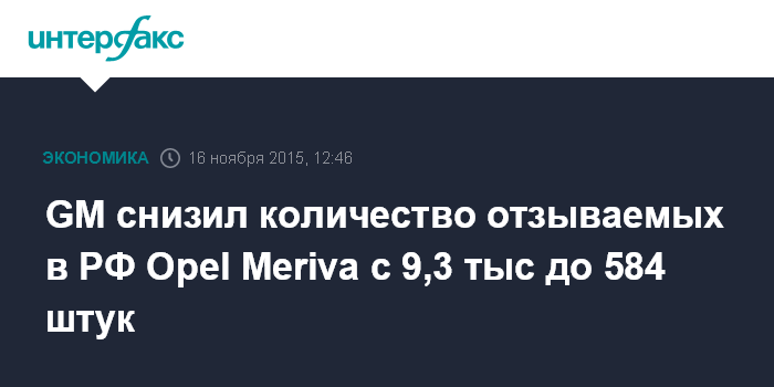 Москва. 16 ноября. INTERFAX.RU – Российское подразделение американского автомобилестроительного концерна General Motors ООО "Джи Эм СНГ" сократило количество отзываемых в РФ автомобилей Opel Meriva-B с 9,354 тыс. до 584 шт., говорится в сообщении Росстандарта.