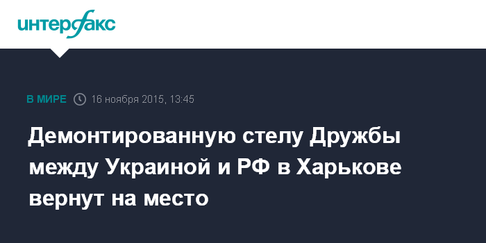 Москва. 16 ноября. INTERFAX.RU - Информация о сносе стелы Дружбы между Украиной и РФ в Харькове, распространенная рядом местных СМИ, не соответствует действительности, заявляют в отделе коммуникаций Главного управления Национальной полиции в Харьковской области.