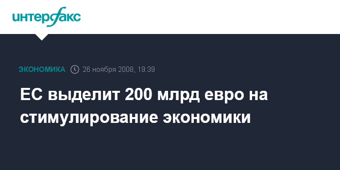 Москва. 26 ноября. INTERFAX.RU - Европейская комиссия в среду объявила о выделении 200 млрд евро, что составляет 1,5% ВВП единой Европы, для стимулирования экономики ЕС и преодоления финансового кризиса, сообщило агентство Bloomberg.