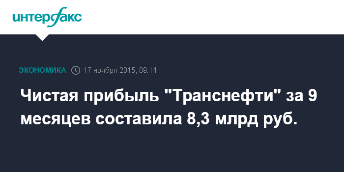 Москва. 17 ноября. INTERFAX.RU - Чистая прибыль ОАО "АК "Транснефть" по российским стандартам (РСБУ) за 9 месяцев 2015 года составила 8,3 млрд рублей, что на 2% ниже показателя за январь-сентябрь 2014 года (8,515 млрд рублей), следует из отчета компании.