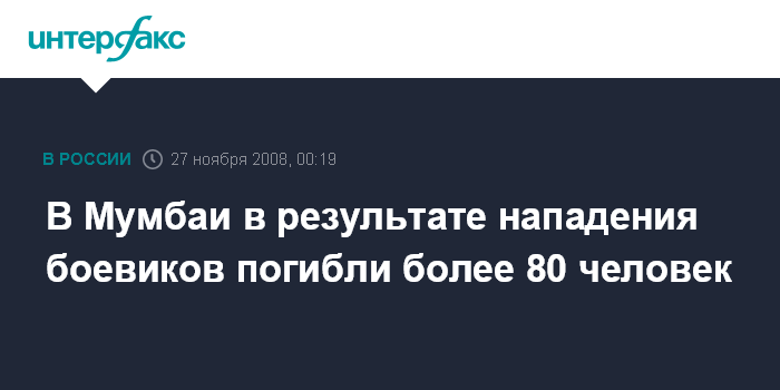 Лондон. 27 ноября. ИНТЕРФАКС - В Индии в г. Мумбаи (Бомбей) в результате скоординированной серии нападений погибло по меньшей мере 80 человек, сообщает британская телерадиовещательная корпорация "Би-би-си".