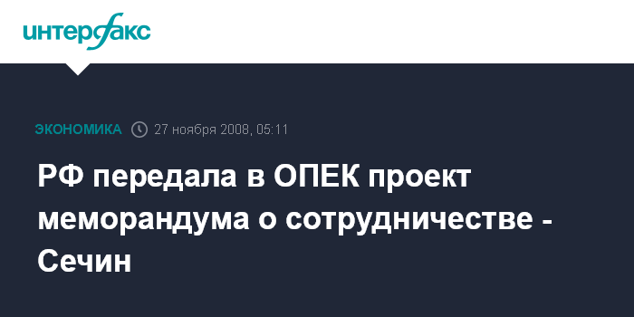 Каракас. 27 ноября. ИНТЕРФАКС - Россия передала в ОПЕК проект меморандума о сотрудничестве, сообщил вице-премьер РФ Игорь Сечин.