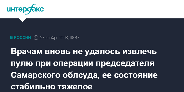 Москва. 27 ноября. INTERFAX.RU - Врачи самарской больницы имени Пирогова при повторной операции не смогли вынуть пулю из тела находящейся в больнице председателя суда Самарской области Любови Дроздовой, которая получила огнестрельное ранение в живот в результате покушения.