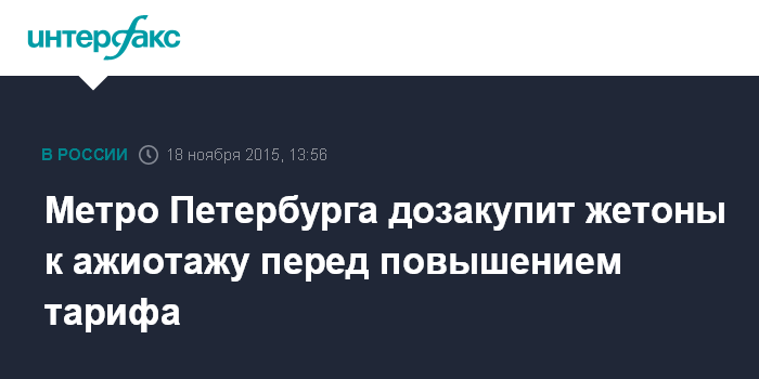 Москва. 18 ноября. INTERFAX.RU - Петербургский метрополитен намерен закупить дополнительную партию жетонов в декабре, чтобы исключить ограничение их продажи в одни руки в преддверии возможного повышения тарифа.