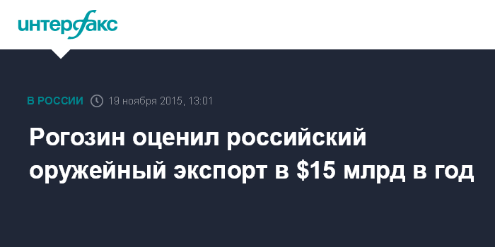 Москва. 19 ноября. INTERFAX.RU - Россия зарабатывает более 15 млрд долларов в год на экспортных поставках вооружения, завил вице-премьер РФ Дмитрий Рогозин.