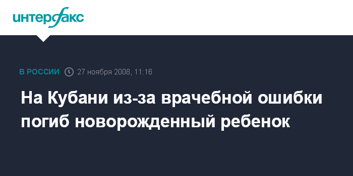 Москва. 27 ноября. INTERFAX.RU - Возбуждено уголовное дело по факту смерти новорожденного мальчика в акушерском отделении МУЗ "Центральная городская больница города Кропоткина" (Краснодарский край). Как сообщает в четверг СКП РФ, дело возбуждено по ч. 2 статьи 109 УК РФ (причинение смерти по неосторожности вследствие ненадлежащего исполнения лицом своих профессиональных обязанностей).