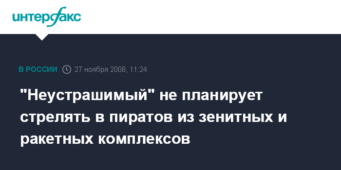 Москва. 27 ноября. INTERFAX.RU - Капитан сторожевого корабля "Неустрашимый" Олег Гуринов не видит необходимости применения в борьбе с сомалийскими пиратами зенитного ракетного вооружения.