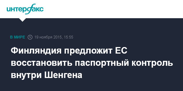 Москва. 19 ноября. INTERFAX.RU - Финляндия на внеочередной встрече министров внутренних дел и юстиции ЕС в пятницу предложит принять решение о едином и временном восстановлении пограничного контроля в Шенгенском пространстве.