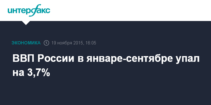 Москва. 19 ноября. INTERFAX.RU – ВВП России в январе-сентябре 2015 года упал на 3,7%, сообщил Росстат в четверг. Это совпадает с ранее сделанной оценкой Минэкономразвития.