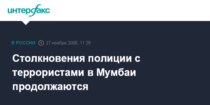 Москва. 27 ноября. INTERFAX.RU - Индийский город Мумбаи погрузился в хаос после того, как группы вооруженных лиц совершили ряд скоординированных терактов в различных районах города, в результате которых 101 человек был убит и еще 314 ранены, сообщает телеканал CNN. "Среди шести убитых иностранцев один британец и один австралиец", - сказал Прадип Индулькар, заместитель главы штата Махараштра, в котором находится Мумбаи.