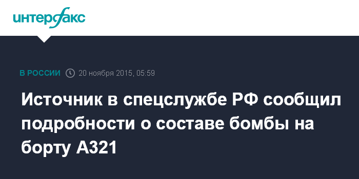 Позднее директор ФСБ Александр Бортников сообщил, что авиакатастрофа российского самолета А321 в Египте 31 октября произошла в результате теракта: на борту самолета была взорвана бомба мощностью до одного кг в тротиловом эквиваленте.