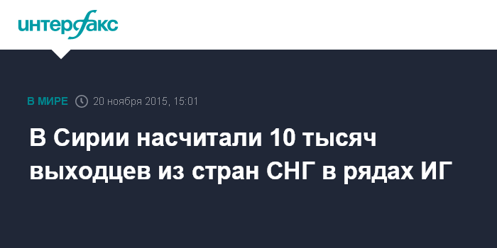 Москва. 20 ноября. INTERFAX.RU - Власти Сирии оценивают численность выходцев из стран СНГ в составе вооруженных формирований экстремистского "Исламского государства" (запрещено в РФ) в 10 тысяч человек.