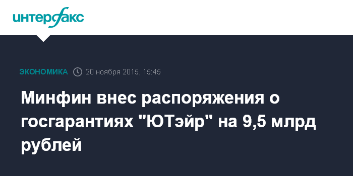 Москва. 20 ноября. INTERFAX.RU – Минфин внес в правительство проект распоряжения о предоставлении авиакомпании "ЮТэйр" госгарантии по кредитам на сумму 9,5 млрд руб., сообщил "Интерфаксу" источник в одном из профильных ведомств.