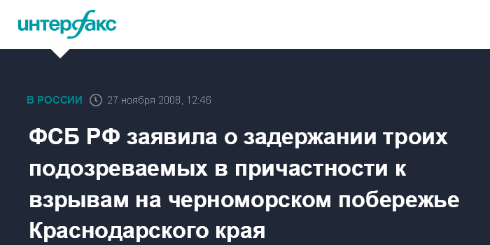 Москва. 27 ноября. INTERFAX.RU - Задержано трое подозреваемых в причастности к взрывам в этом году на Черноморском побережье Краснодарского края, сообщил директор ФСБ, председатель Национального антитеррористического комитета (НАК) Александр Бортников.