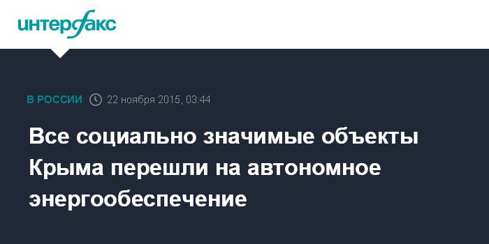 Москва. 22 ноября. INTERFAX.RU - В Крыму после отключения электроэнергии все объекты жизнеобеспечения и социально-значимые объекты перешли на автономное энергообеспечение.