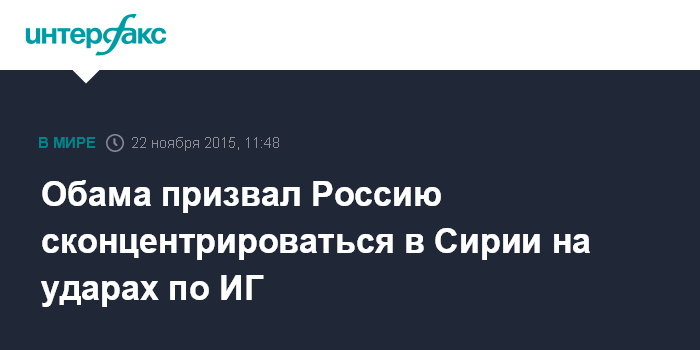 Москва. 22 ноября. INTERFAX.RU - Президент США Барак Обама выразил в воскресенье надежду на то, что удары российской авиации в Сирии будут сфокусированы на ИГ ("Исламское государство", запрещено в РФ), а не на других группировках, сообщают западные СМИ.
